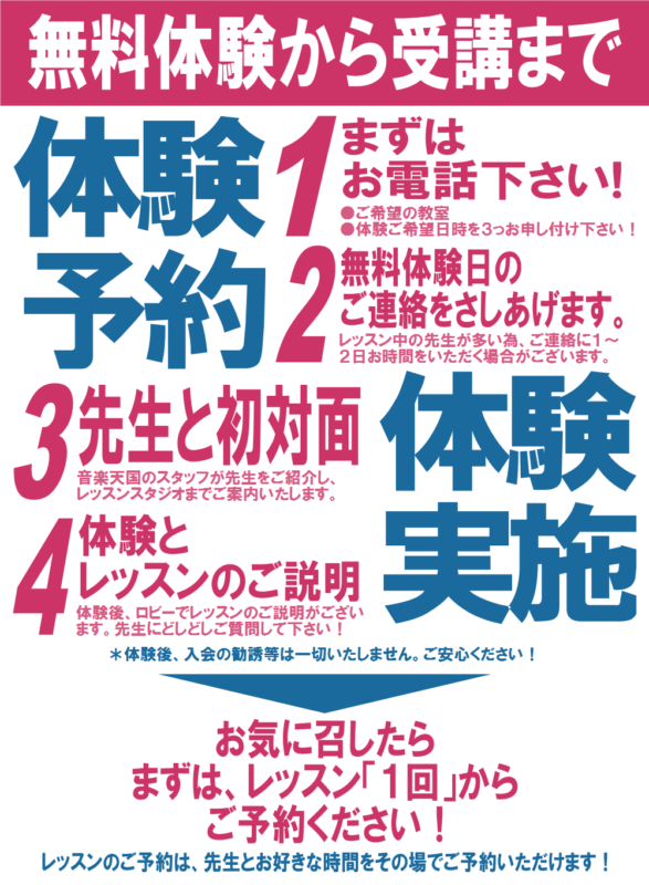 先生から後ほどご連絡させて頂きますので、教室の詳細、体験日時など先生と直接ご相談ください。